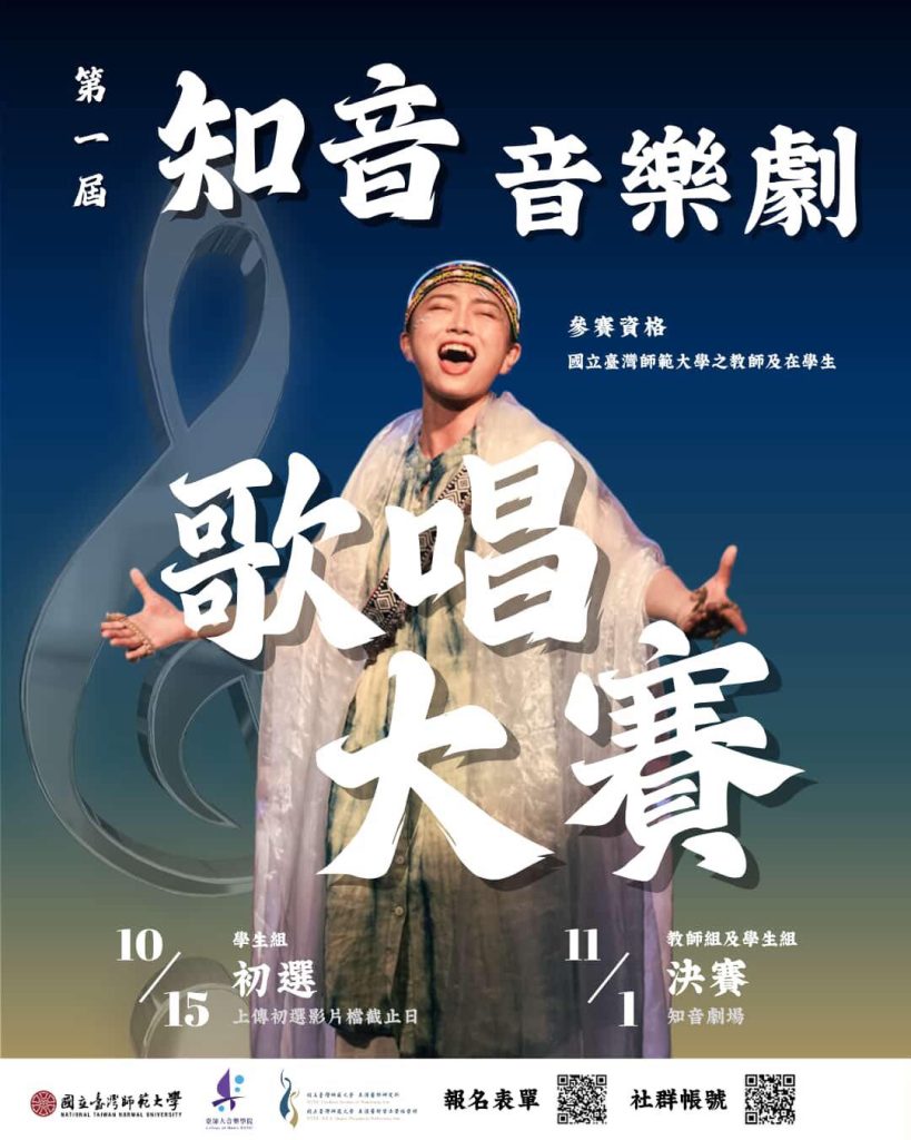 知音音樂劇大賽 Post author:gipa Post published:2025-10-03 【第一屆 知音音樂劇歌唱大賽】比賽簡章公布咚咚咚!咚咚咚!報名簡章新鮮出爐啦!想要成為音樂劇歌唱大賽的優勝者嗎?想要成為音樂劇歌唱天王/天后嗎?現在機會來了!還不拿起你的小手手點開簡章一探究竟? 活動時間:2025/11/1(六)活動地點:臺師大和平校區II綜合大樓10樓(知音劇場)活動費用:免費參加報名期限:10/2(四)至 10/15(三)23:59止參與對象:國立臺灣師範大學全體師生報名方式:填寫報名表單,學生組需上傳初選檔案 獎項與獎品各組將評選出冠軍、亞軍、季軍各一名、優等兩名。教師組:獎狀乙張。學生組:冠軍|獎盃乙座,獎金新臺幣伍仟元。亞軍|獎盃乙座,獎金新臺幣參仟元。季軍|獎盃乙座,獎金新臺幣壹仟元。優等|獎狀乙張,獎金新臺幣伍佰元。 114學年度知音音樂劇歌唱大賽 比賽簡章